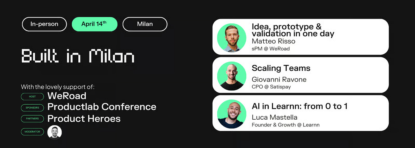 Thanks to Simone Basso for hosting us, and to our speakers—Matteo Risso (sPm at WeRoad), Giovanni Ravone (CPO at Satispay), and Luca Mastella (Co-founder / Growth at Learnn).
