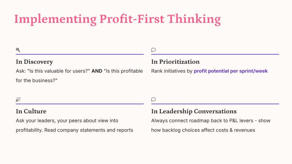 In leadership conversations: Always connect your roadmap back to P&L levers. Show how your backlog choices affect costs and revenues.