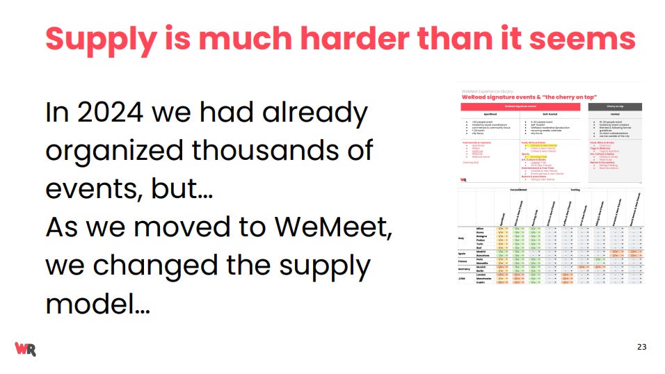 WeRoad initially tried to be everything: bottom-up events, top-down organized dinners, 30 different cities, diverse event types from London to Bari.