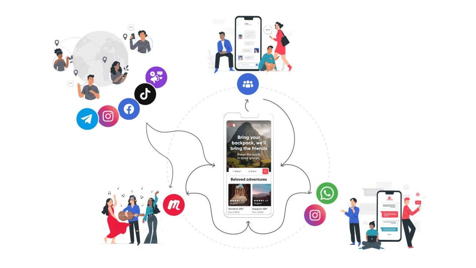 Here’s how it works: Travelers join through social channels, do a weekend group trip with 15 strangers aged 25-49, then some become coordinators (paid guides who travel for free). These coordinators organize more events and trips, attracting more travelers.